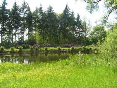 Na een goed uur wandelen, het was warm weer, zag ik op de routekaart het woord ‘natuurbad’ geschreven bij een klein blauw rondje. Het was niet gemakkelijk te vinden en aanvankelijk liepen we er voorbij en omheen maar daar lag het dan: een ovalen vijver, deels met hout beschoeid en aan een zijde uitlopend in een glooiend, keurig onderhouden gazon. Om de hele vijver liep een graspad en om tweederde van de vijver stonden blauwpaarse en roze rododendrons in bloei. Het geheel werd gecompleteerd door hoge dennenbomen rondom, maar niet zoveel dat de zon er niet lustig tussendoor scheen.