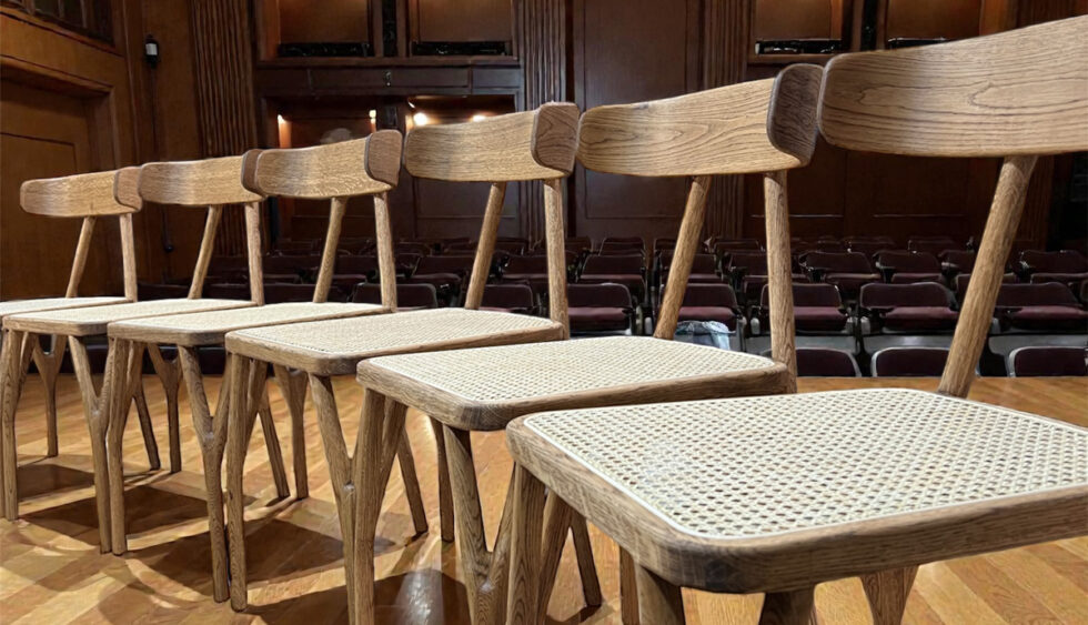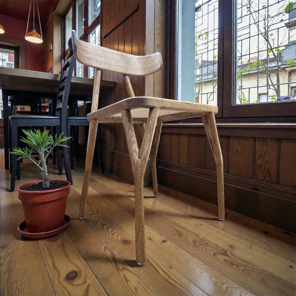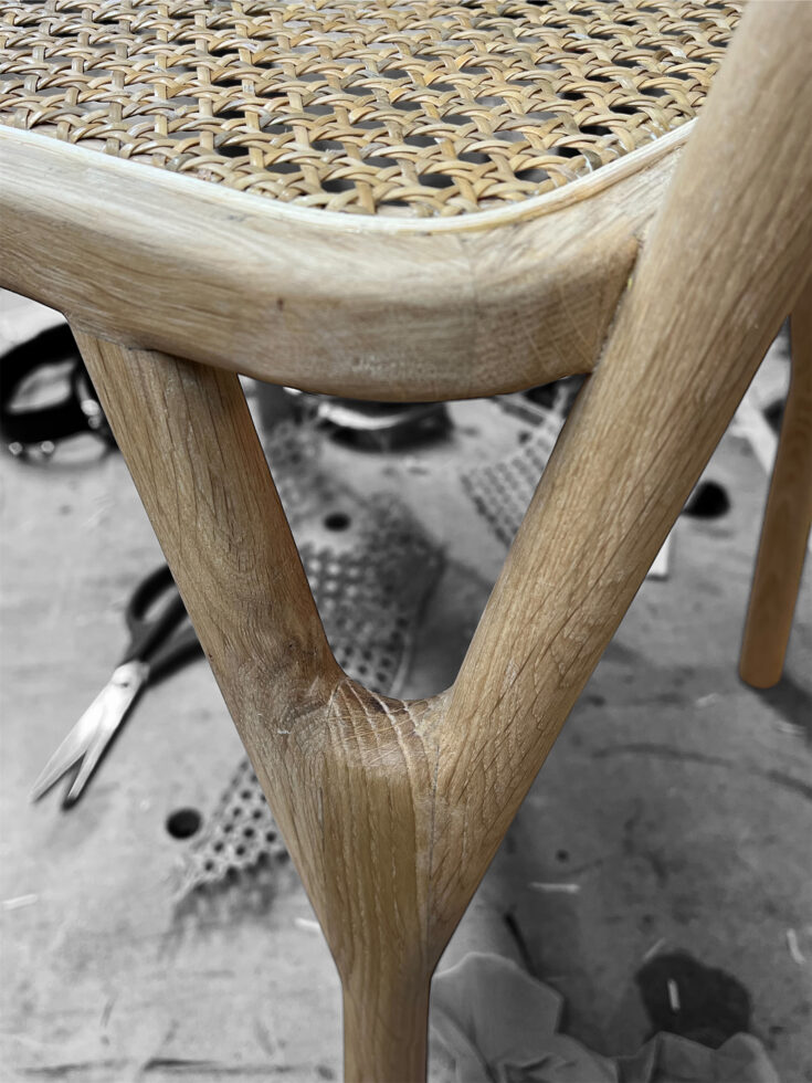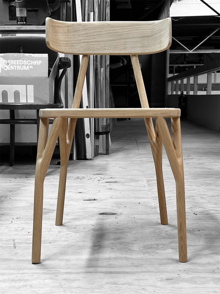 Het stoelontwerp ‘Wichel’ is gegroeid uit het oorspronkelijke idee een stoel te maken met poten als takken. Elke gespleten eikenhouten poot, de ‘wichelroede’ bestaat uit drie delen die mooi in elkaar grijpen. Elke poot ondersteunt de zitting op twee punten in plaats van alleen op de hoek. Dat maakt deze stoel slank, sterk én stabiel. De achterste ‘takken’ lopen door en dragen de gebogen eikenhouten rugleuning. De zitting is uitgevoerd in rotan, als een ‘nestje’ in de takken.